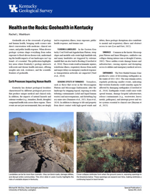 Geohealth bridges the earth and life sciences, revealing how Kentucky’s unique geology directly shapes public health risks, clinical outcomes, and opportunities for innovation. This factsheet highlights the critical intersections between geologic processes and human health across the Commonwealth—from landslides, floods, and tornadoes to radon, mine drainage, and microbial contamination. It outlines how natural and anthropogenic forces influence respiratory illness, cancer, trauma, and infectious disease, and how bedrock and weather extremes define local exposure pathways. Beyond risk, it also showcases Kentucky’s leadership in developing geoscience-informed health solutions: bioremediation, microbial drug discovery, and geologic-health monitoring networks that strengthen preparedness and resilience. Understanding ...Read More
